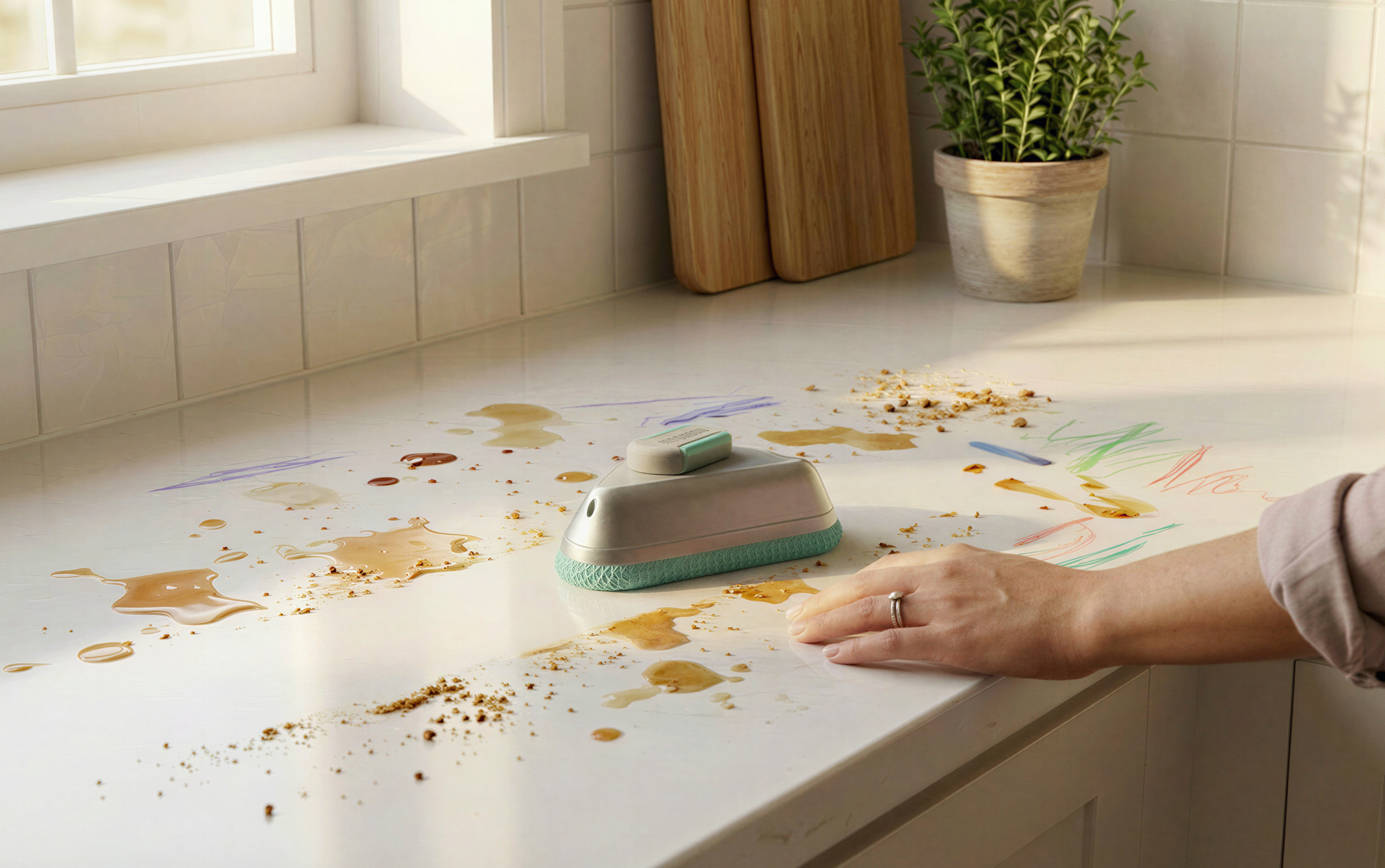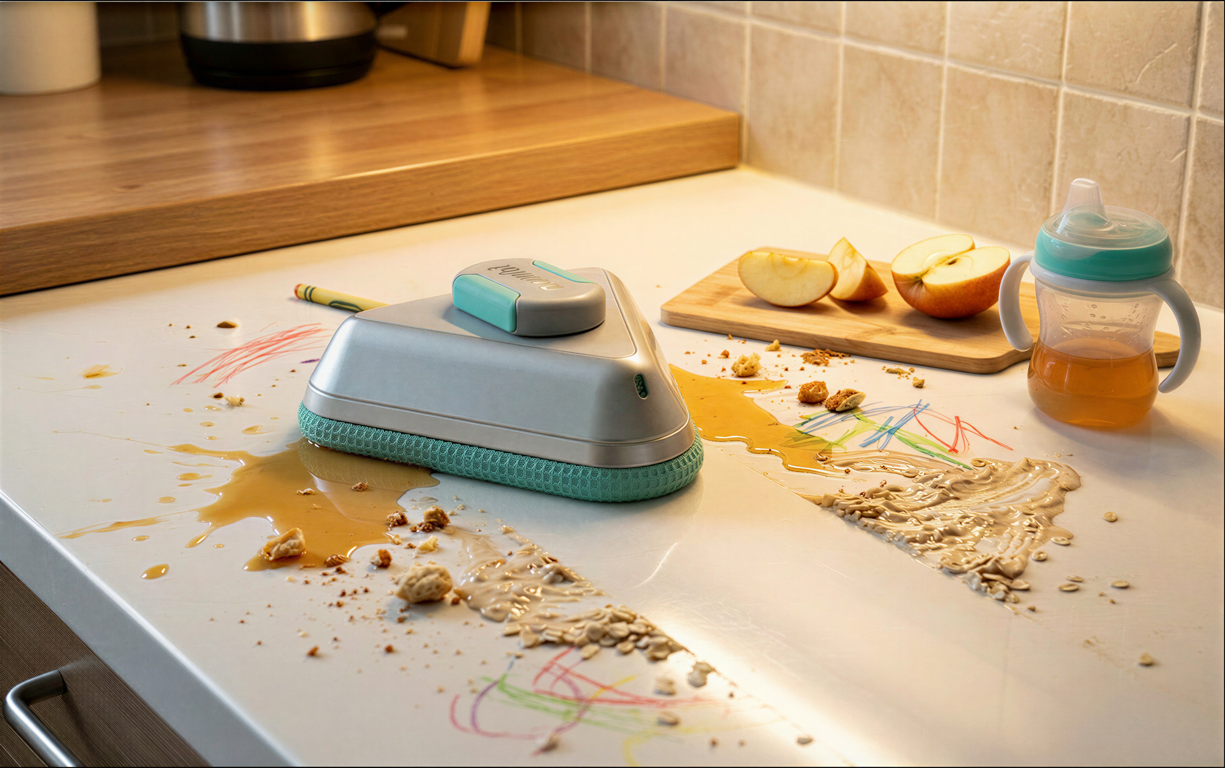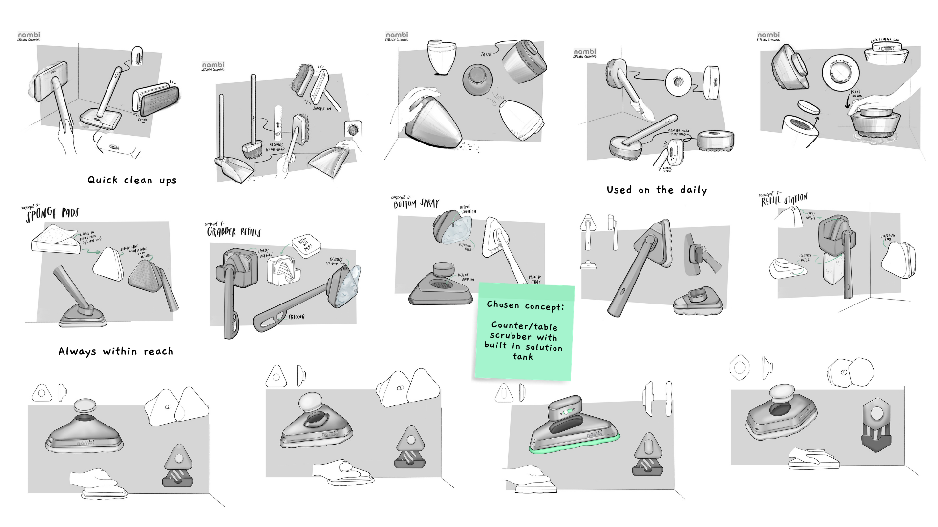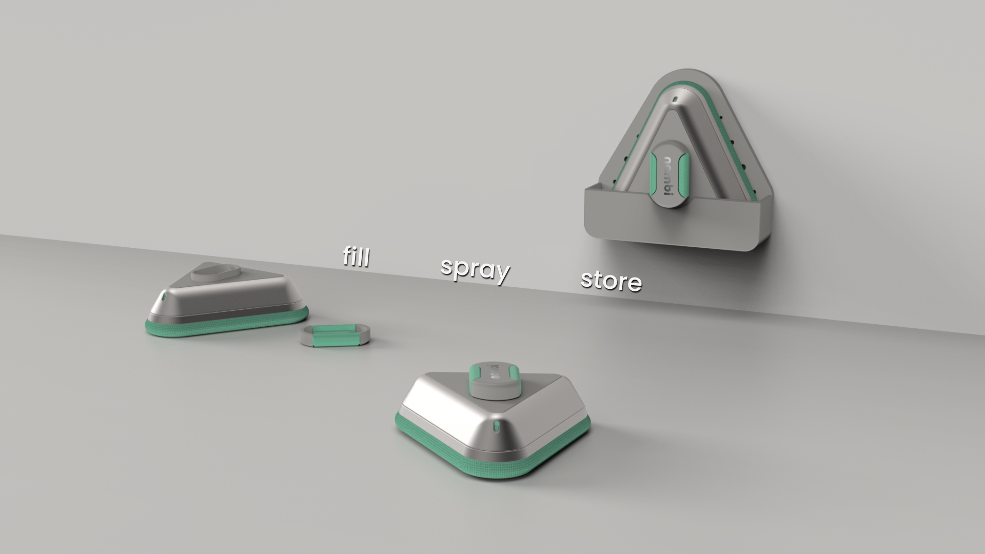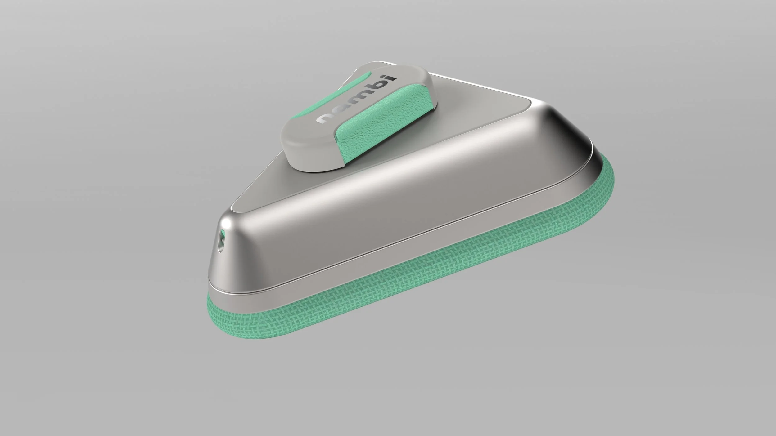 The nambi Kitchen Scrub is a a compact, triangular cleaning tool designed to spray and clean every kitchen surface, from wide edges to deep corners.